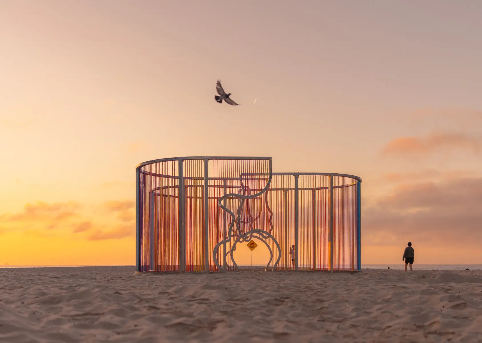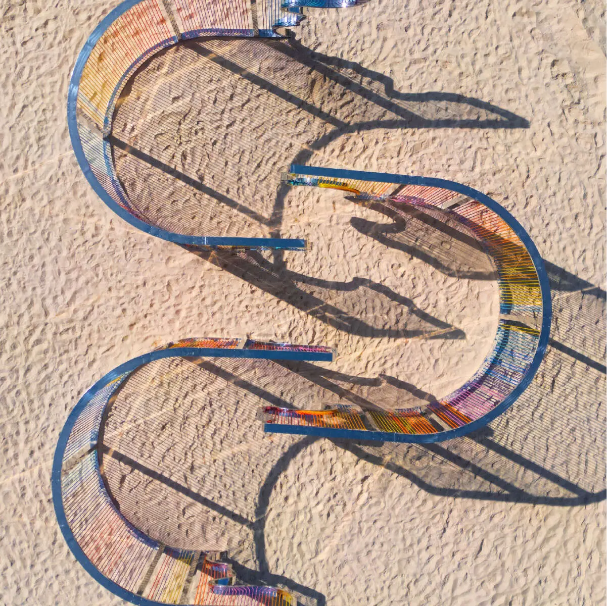 The installation is thoughtfully designed to provide narrower points for gathering, transitional spaces, and moments of rest. This allows viewers to engage with the sculpture at their own pace. The installation is intended to be positioned on the sand to provide ample space for play and exploration.