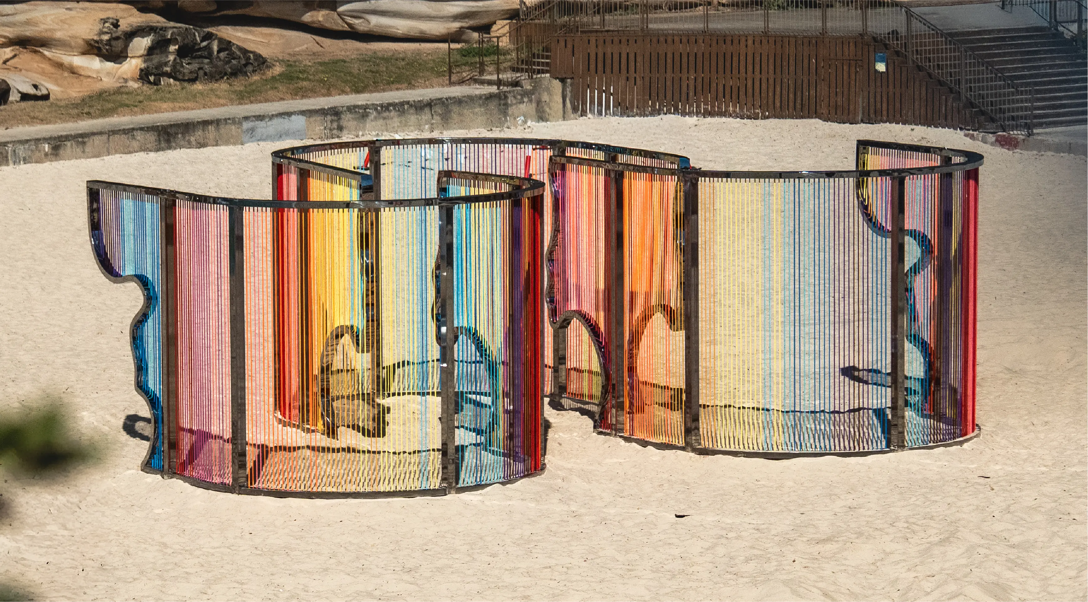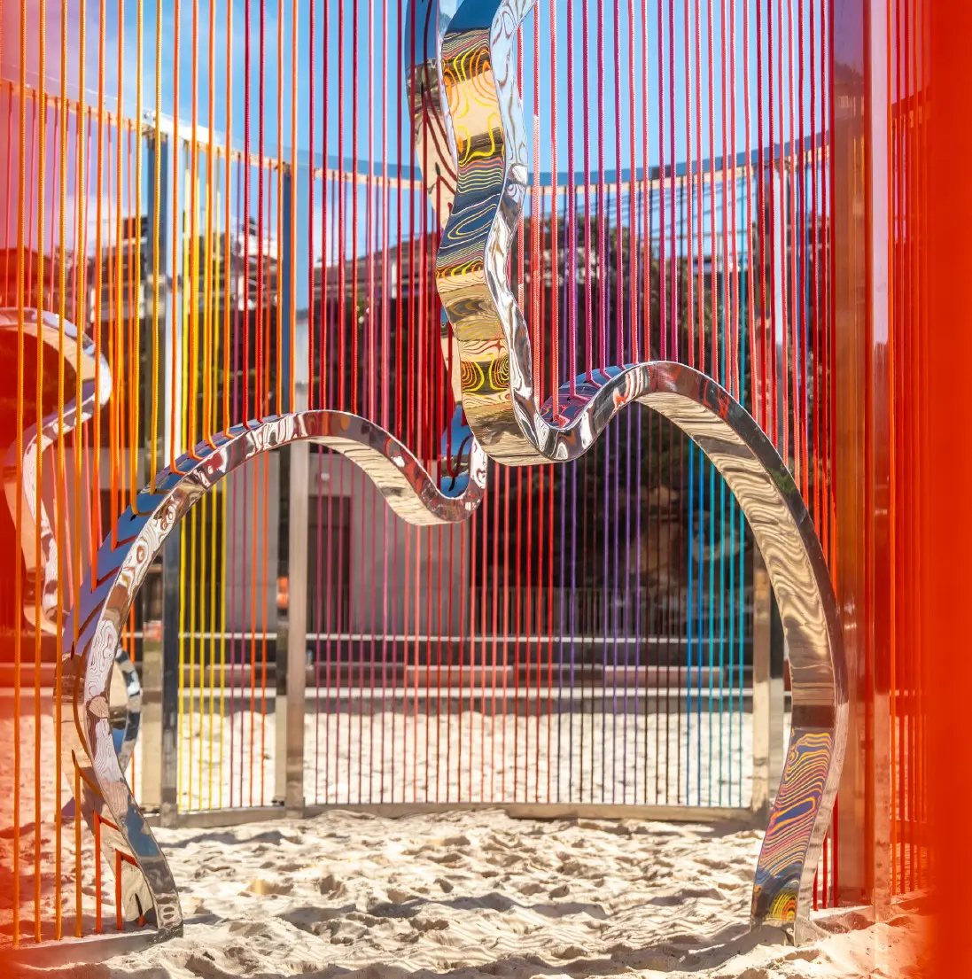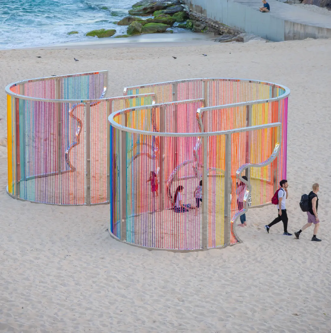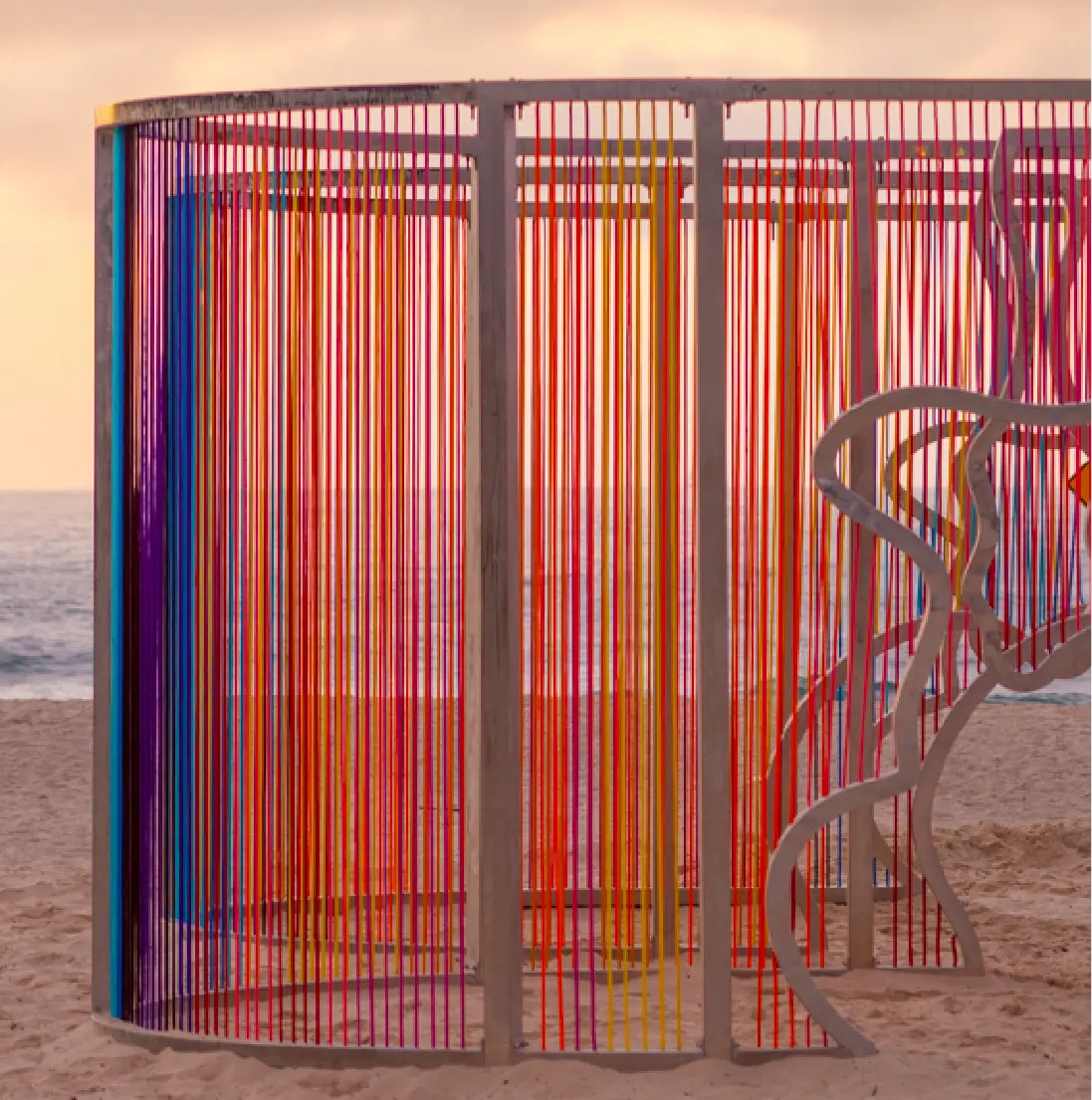 Coastal Threads is an immersive sculpture on Tamarama Beach. Threads in sunset hues form a maze-like structure reflecting Bondi to Bronte's coastline, inviting interaction and offering a fresh perspective on the familiar landscape.