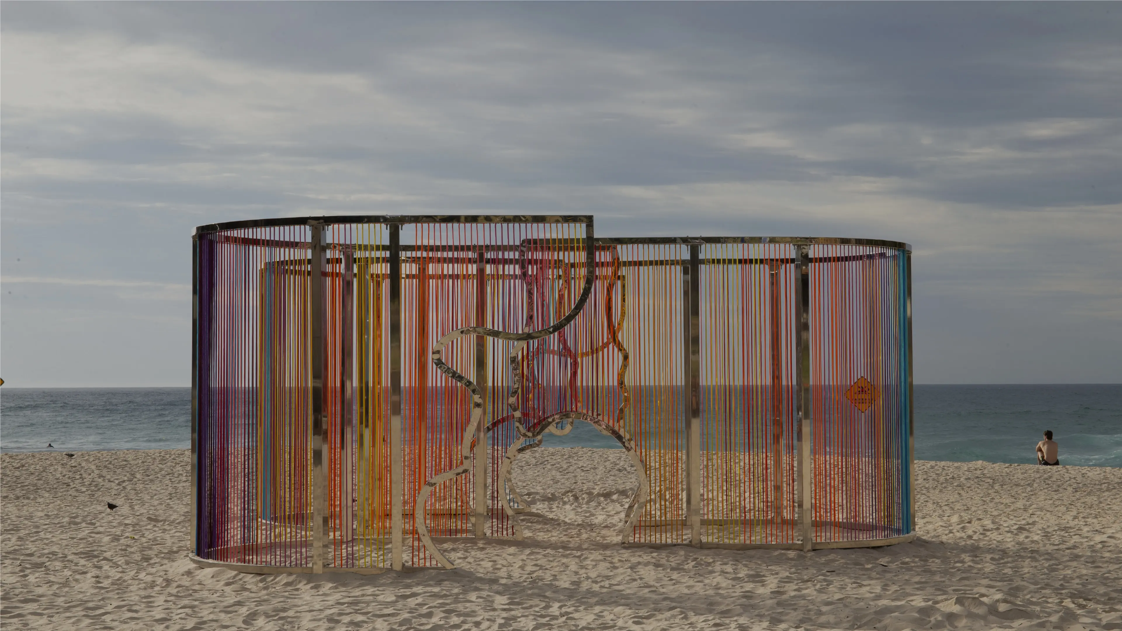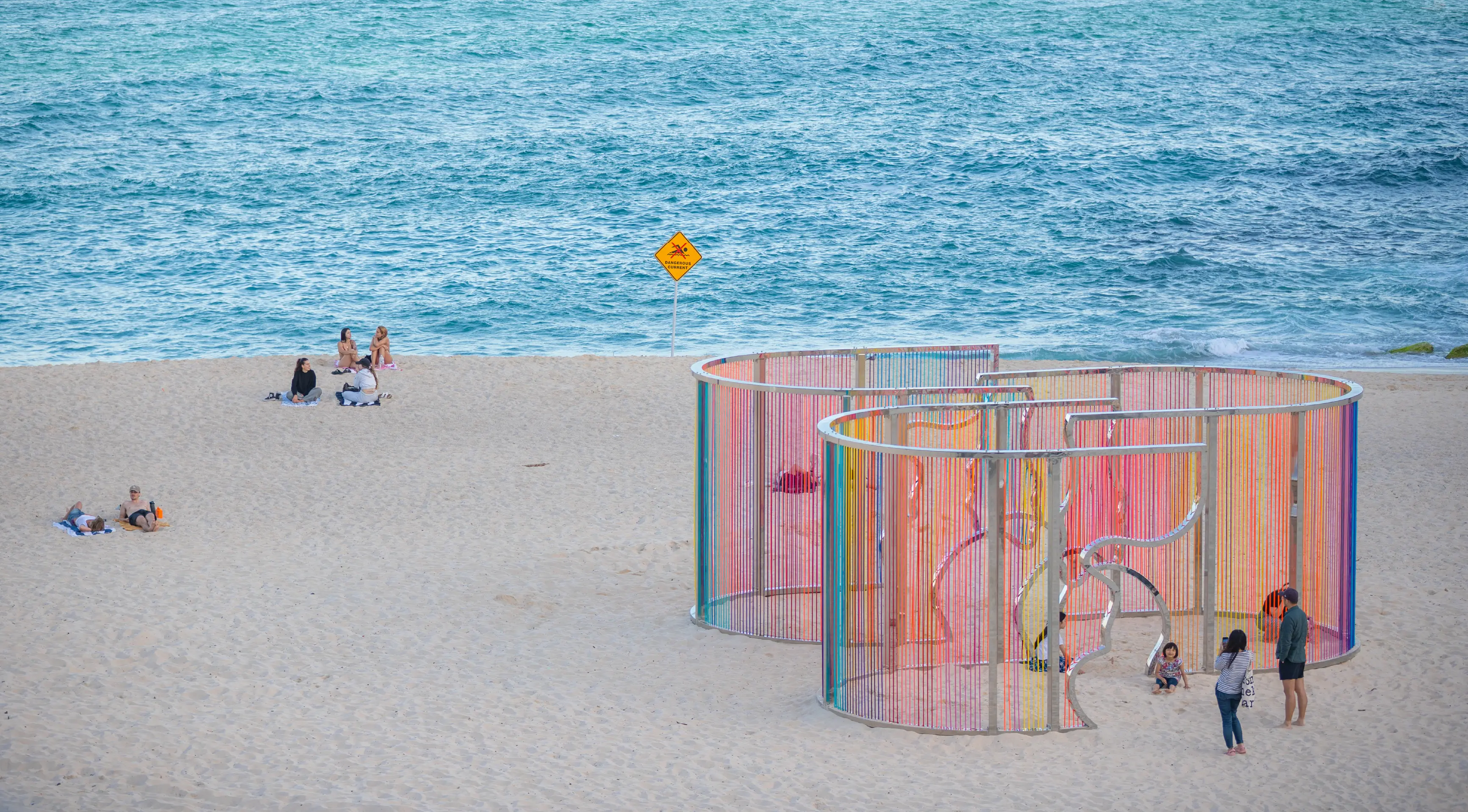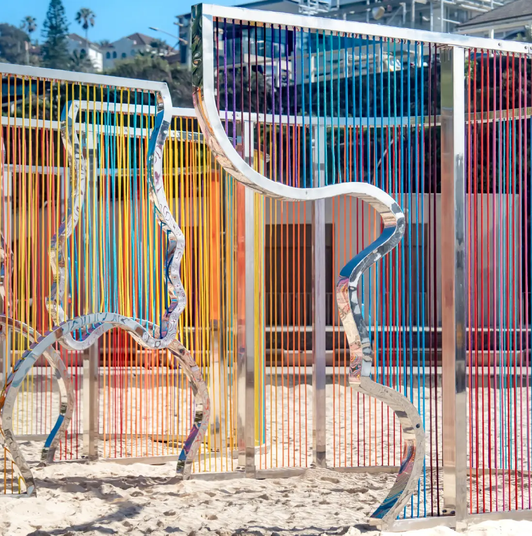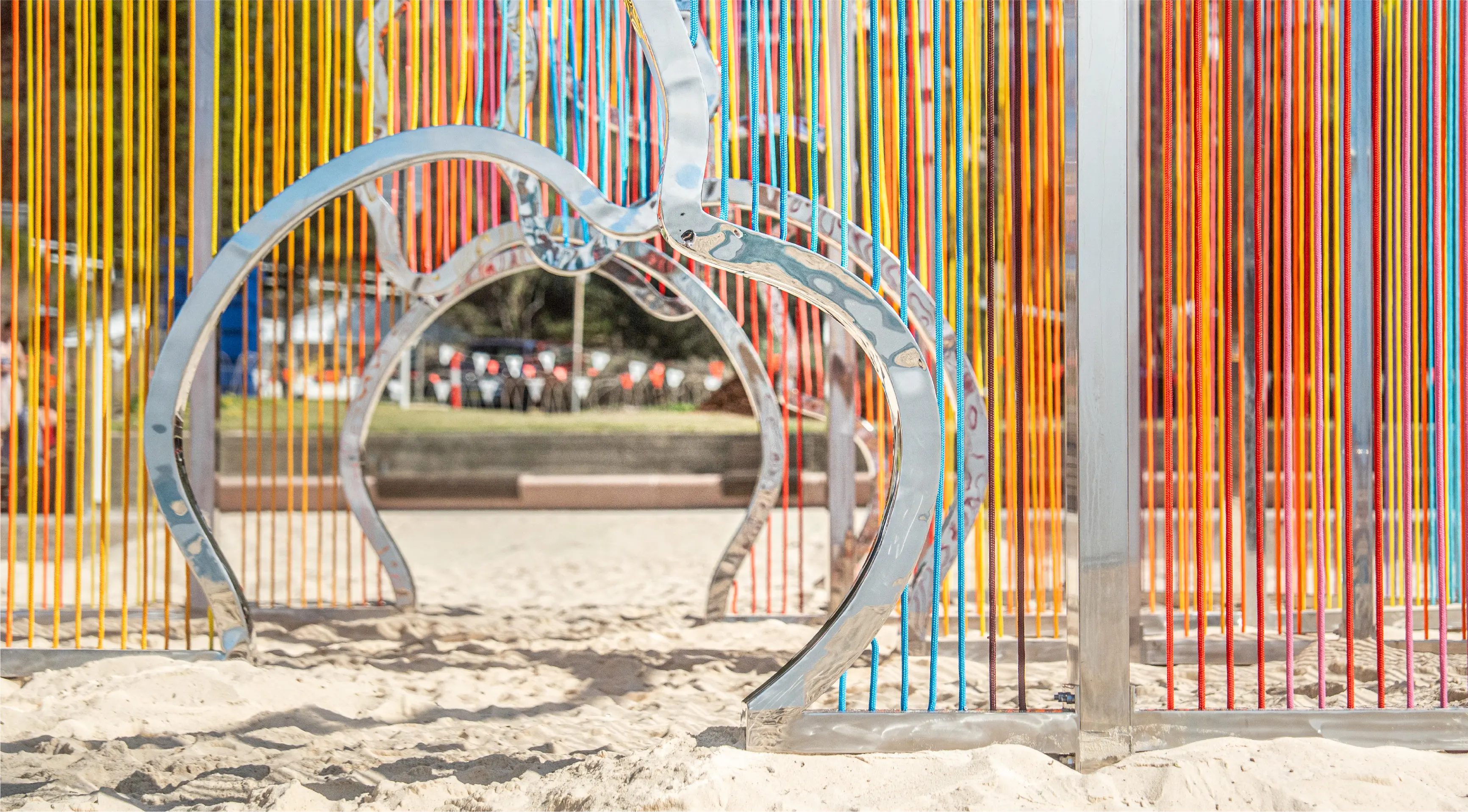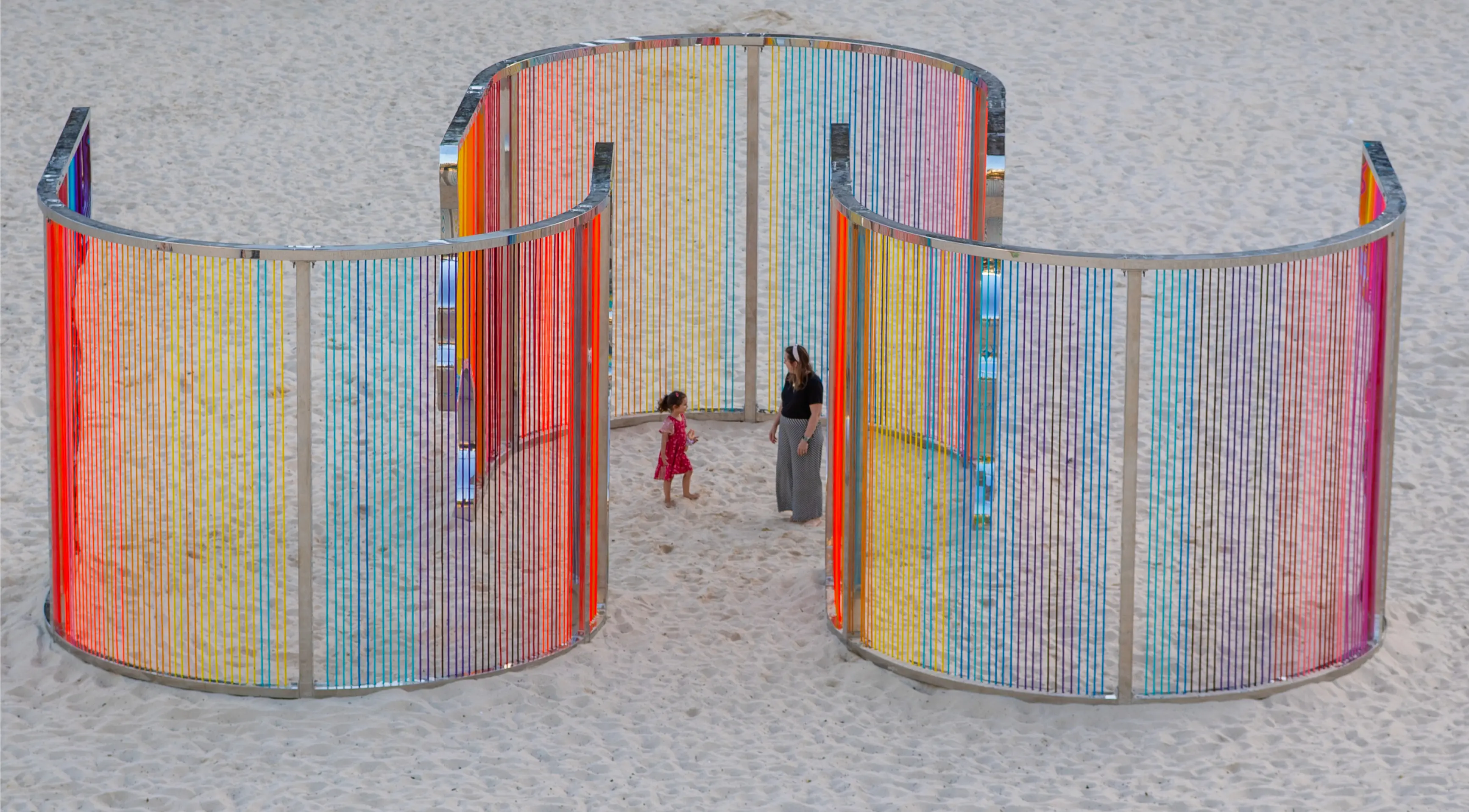 Coastal Threads is an immersive sculpture on Tamarama Beach. Threads in sunset hues form a maze-like structure reflecting Bondi to Bronte's coastline, inviting interaction and offering a fresh perspective on the familiar landscape.