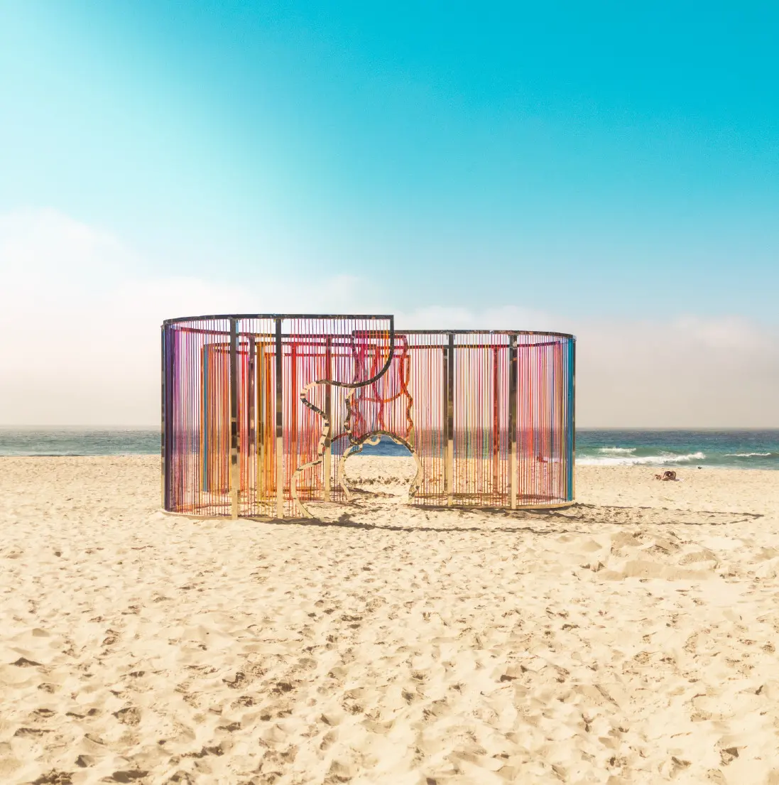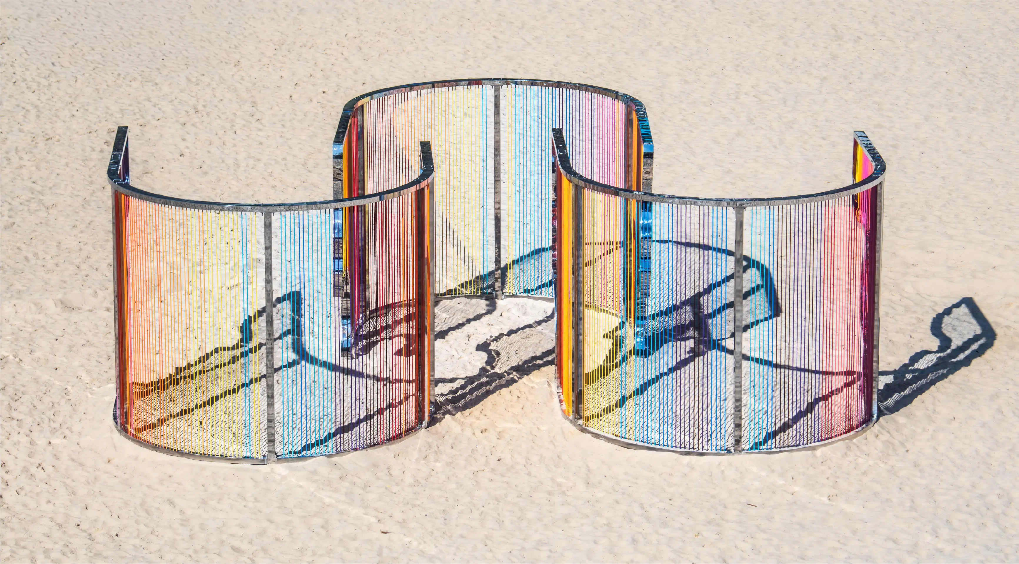 As viewers navigate through the installation, they will experience a kaleidoscope of colour. The juxtaposing colours of the threads against the sand and ocean make the sculpture pop, inviting viewers to see the landscape with a fresh perspective. We believe the sculpture will particularly attract attention due to its scale and vibrancy, leaving a lasting impression…