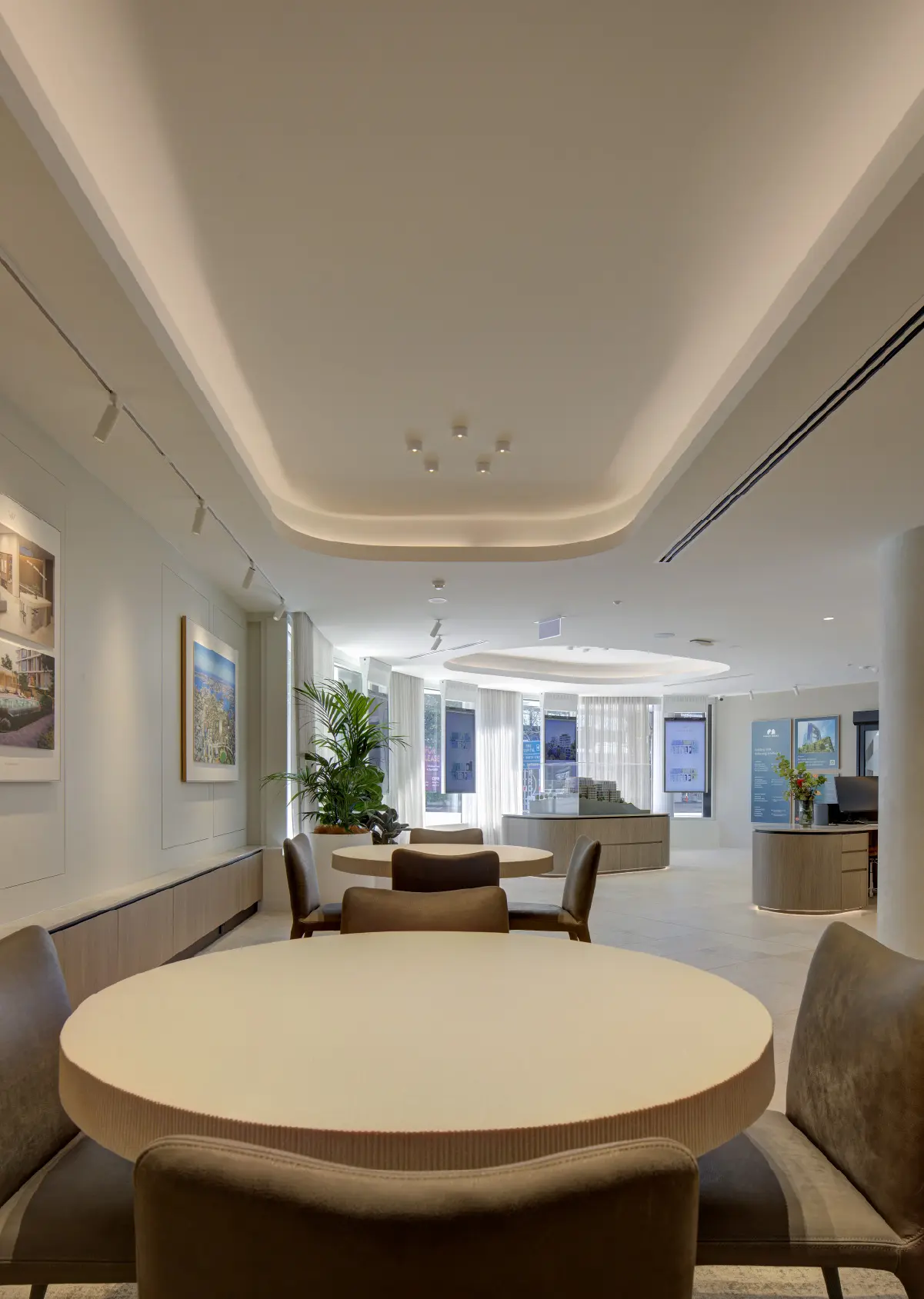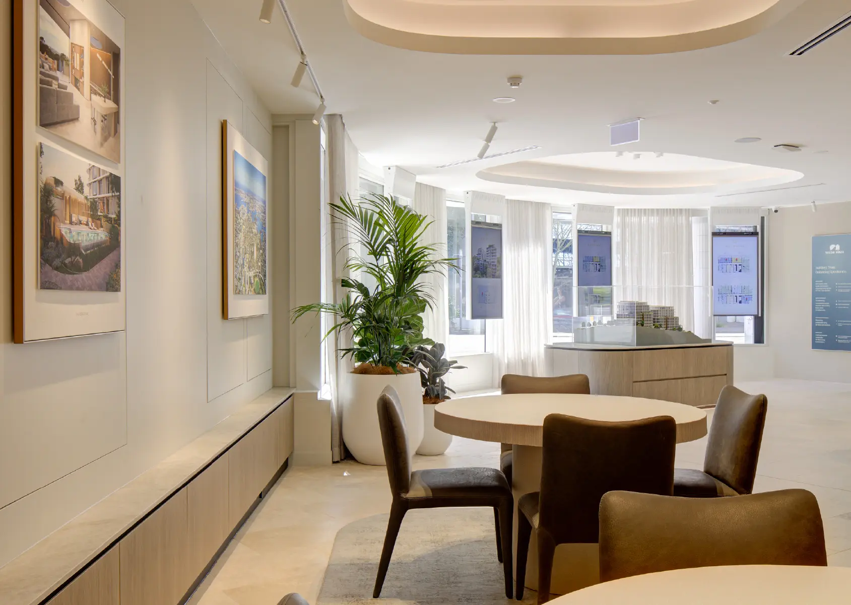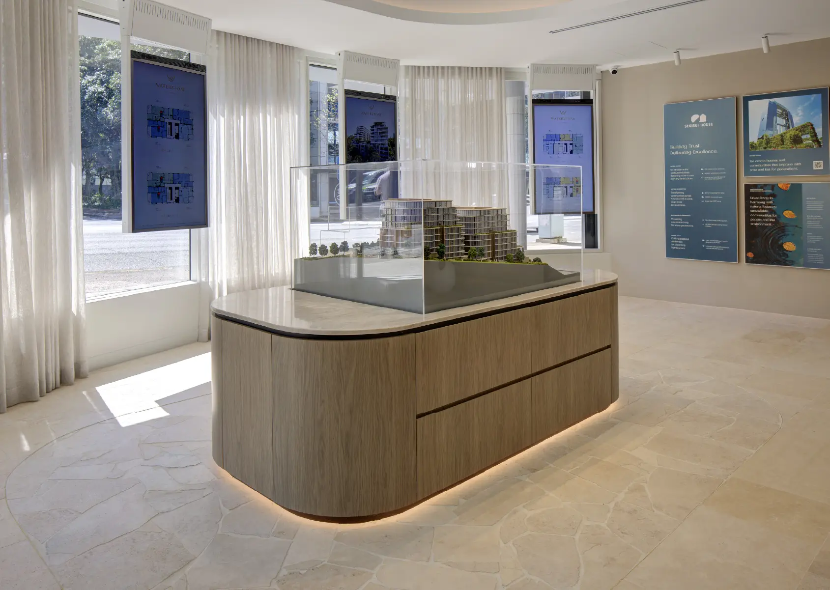 The front of house retail zone is elegantly refined, highlighting the strong branding direction of the project alongside the trusted background of developer Sekisui House Australia through various curated design elements, and the overall architectural narrative told through the scale model, integrated plan displays, and feature project imagery.