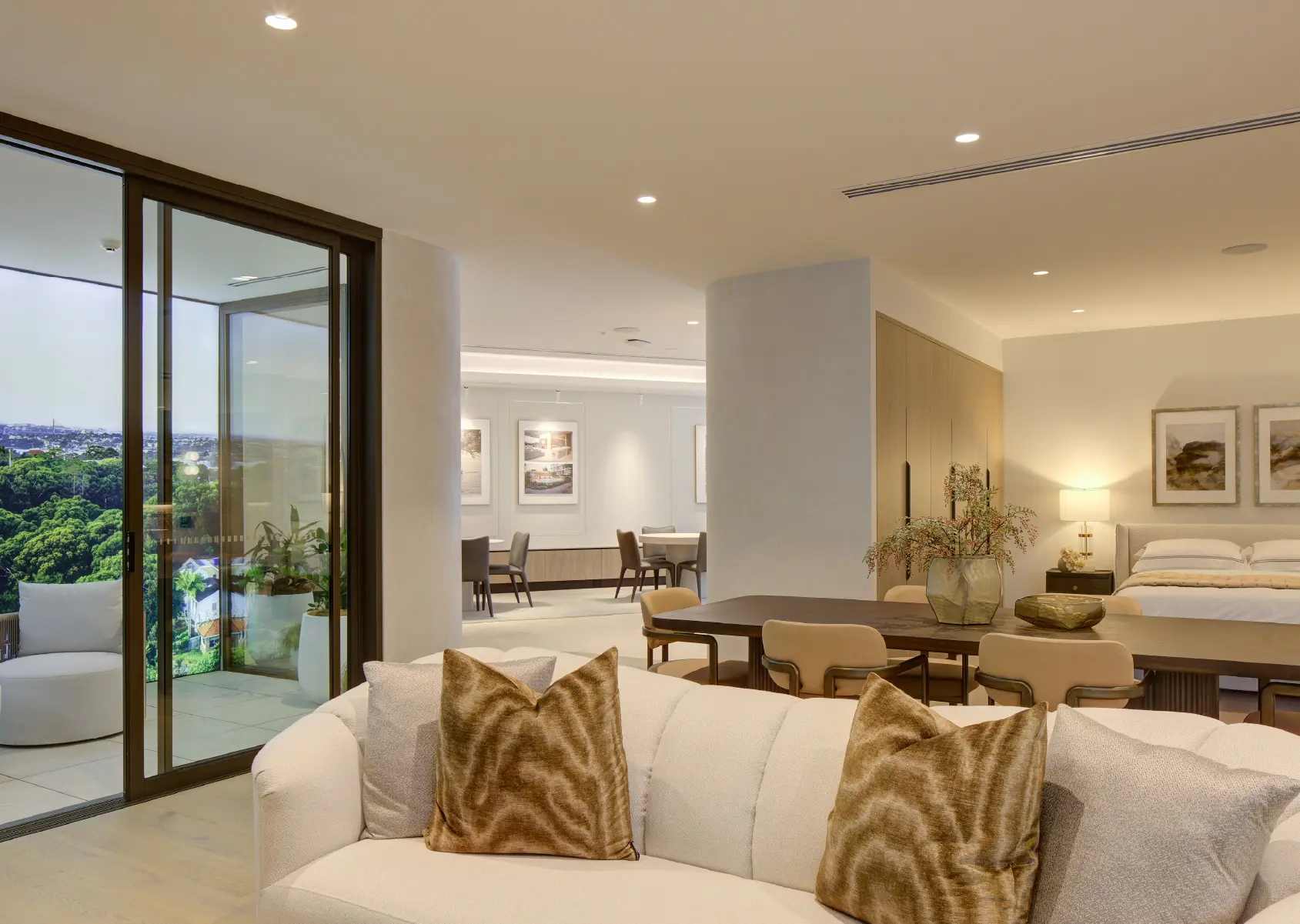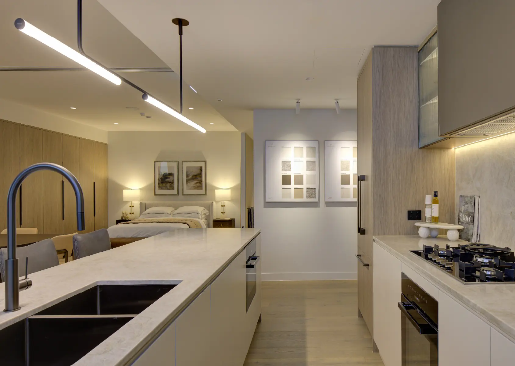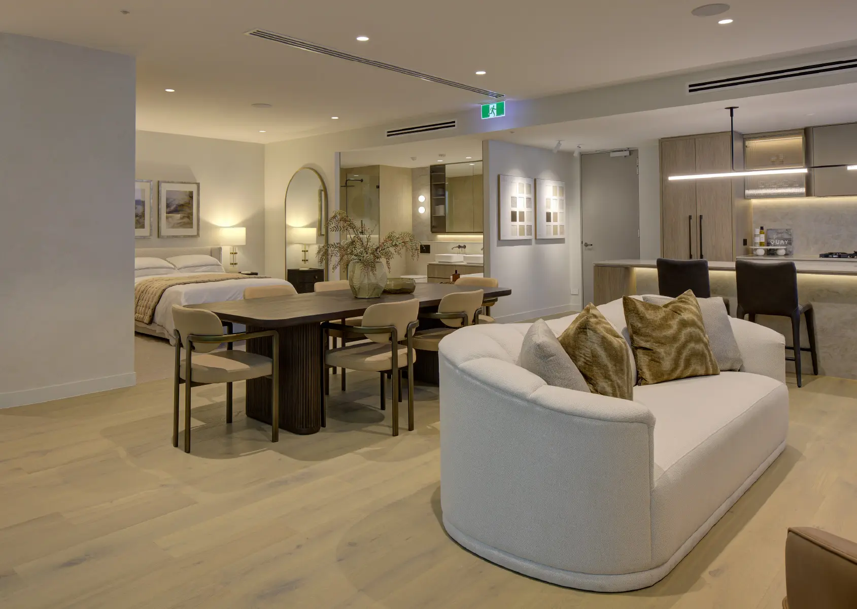 The suite then flows into an open apartment layout in the secondary zone, highlighting the signature interiors of the project with a full kitchen, living, dining, bedroom, bathroom, and balcony. This immersive space brings the apartment experience to life, elevated by tangible materials, aspirational furnishings and integrated digital features like the spanning perspective lightbox, which all play an important role in enriching the atmosphere of the suite.