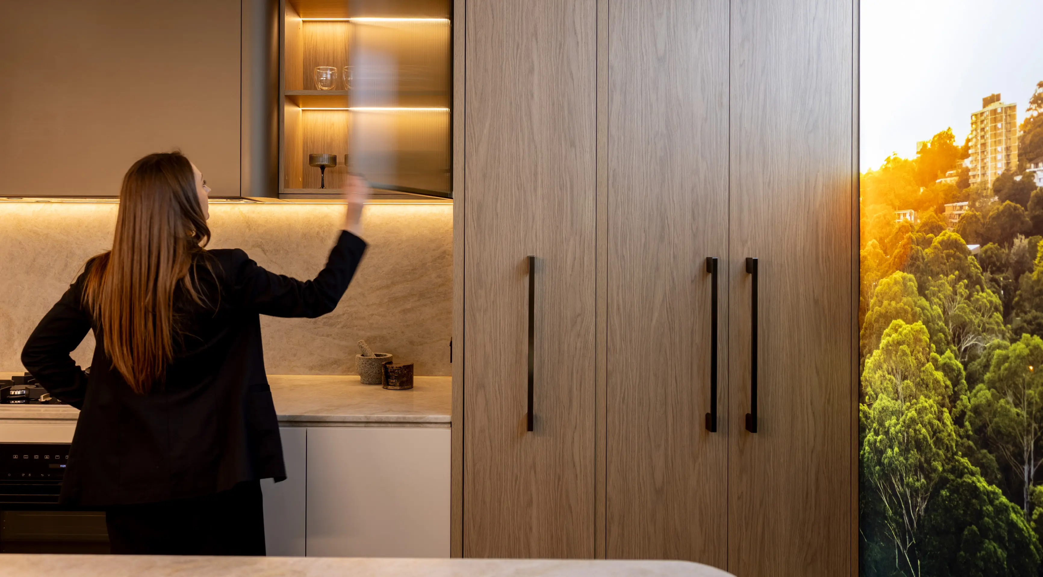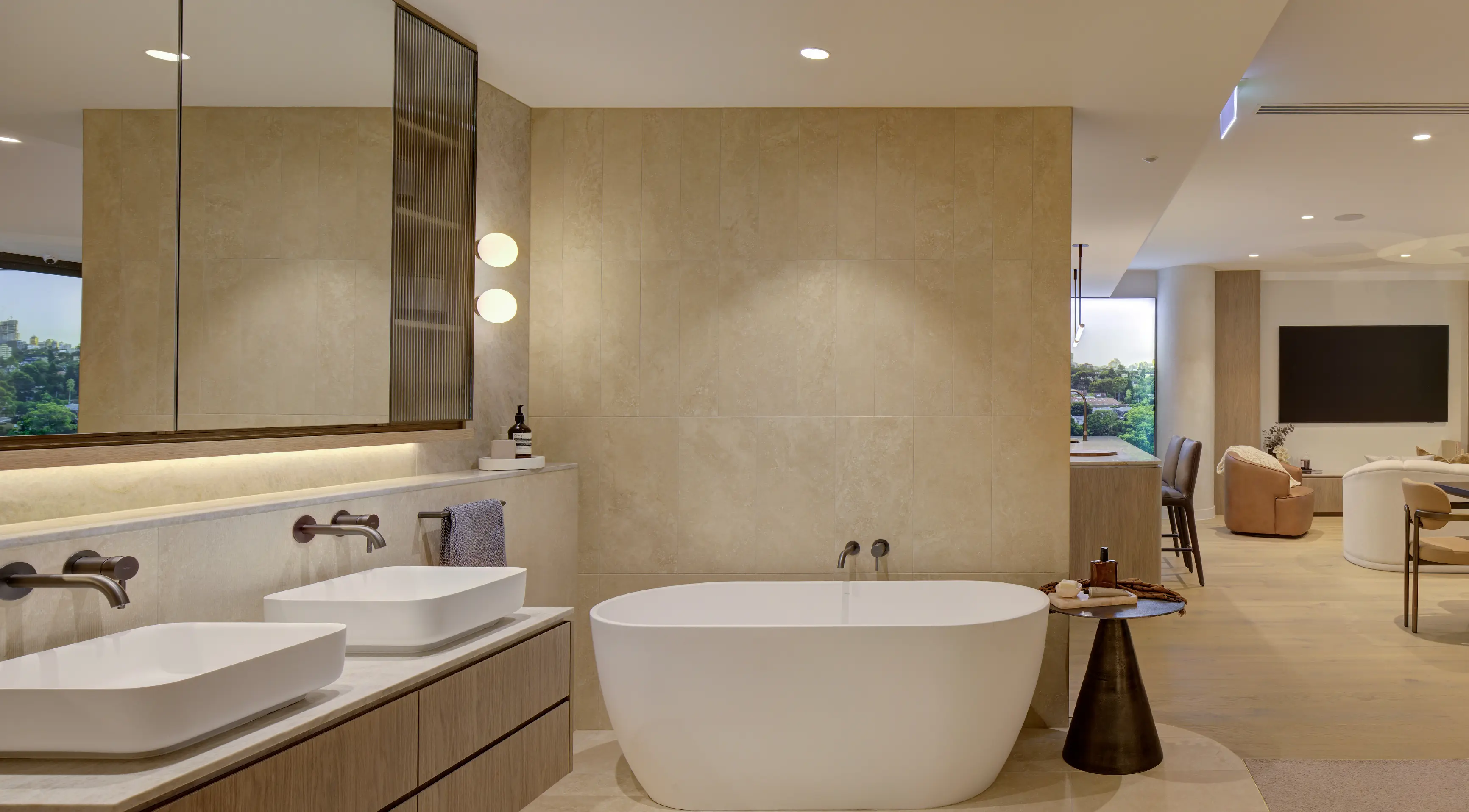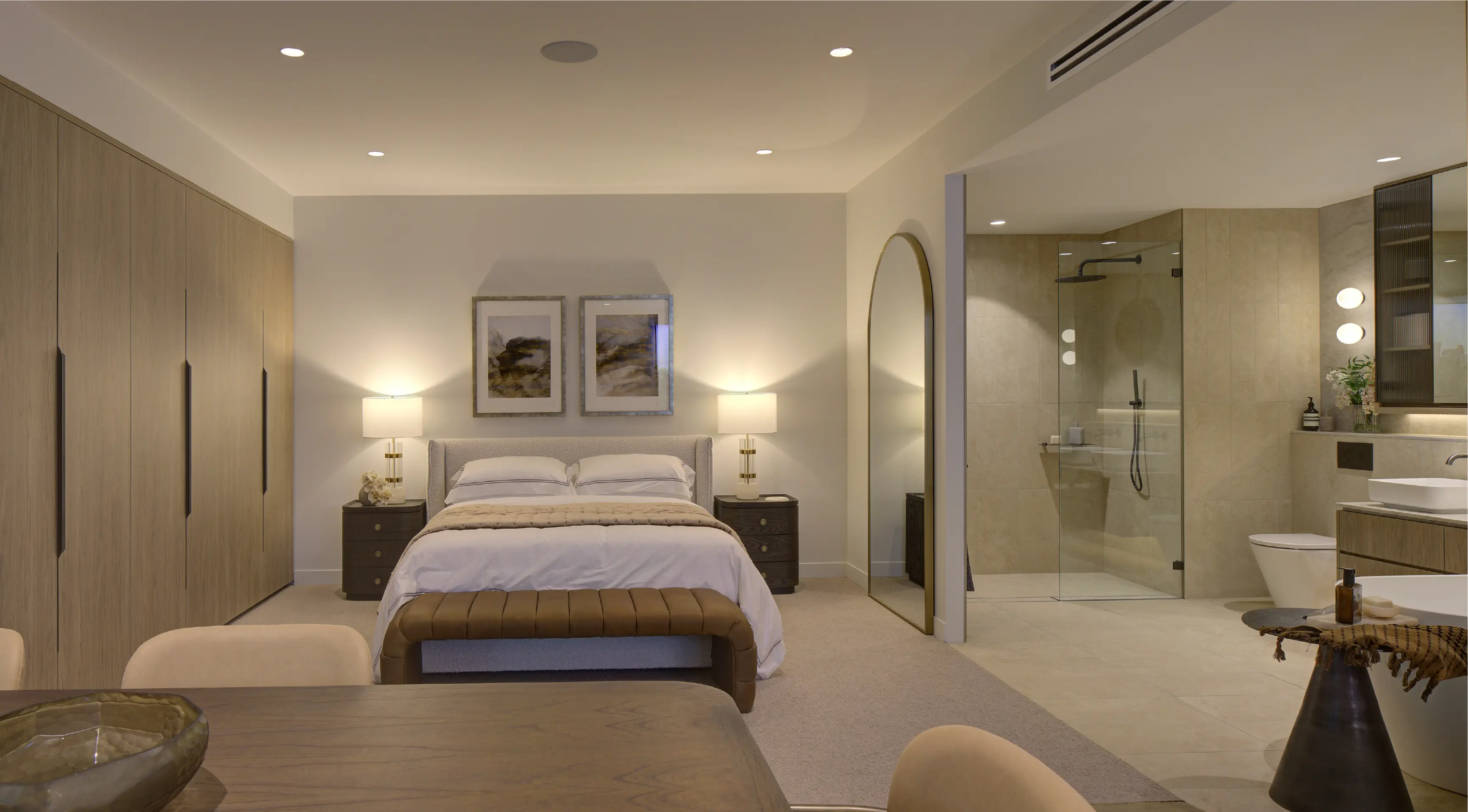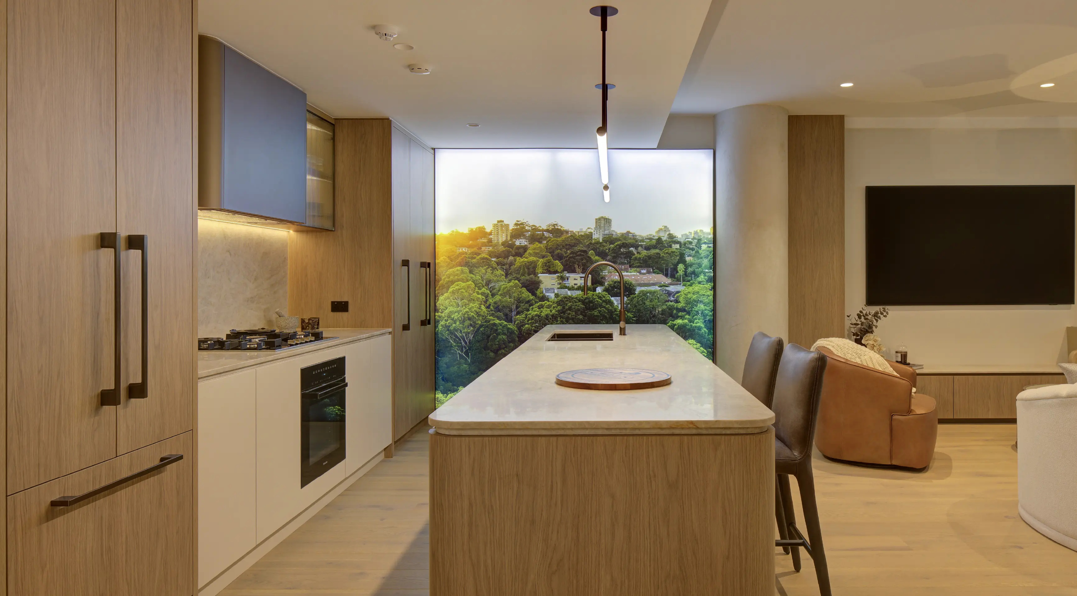 The suite then flows into an open apartment layout in the secondary zone, highlighting the signature interiors of the project with a full kitchen, living, dining, bedroom, bathroom, and balcony. This immersive space brings the apartment experience to life, elevated by tangible materials, aspirational furnishings and integrated digital features like the spanning perspective lightbox, which all play an important role in enriching the atmosphere of the suite.