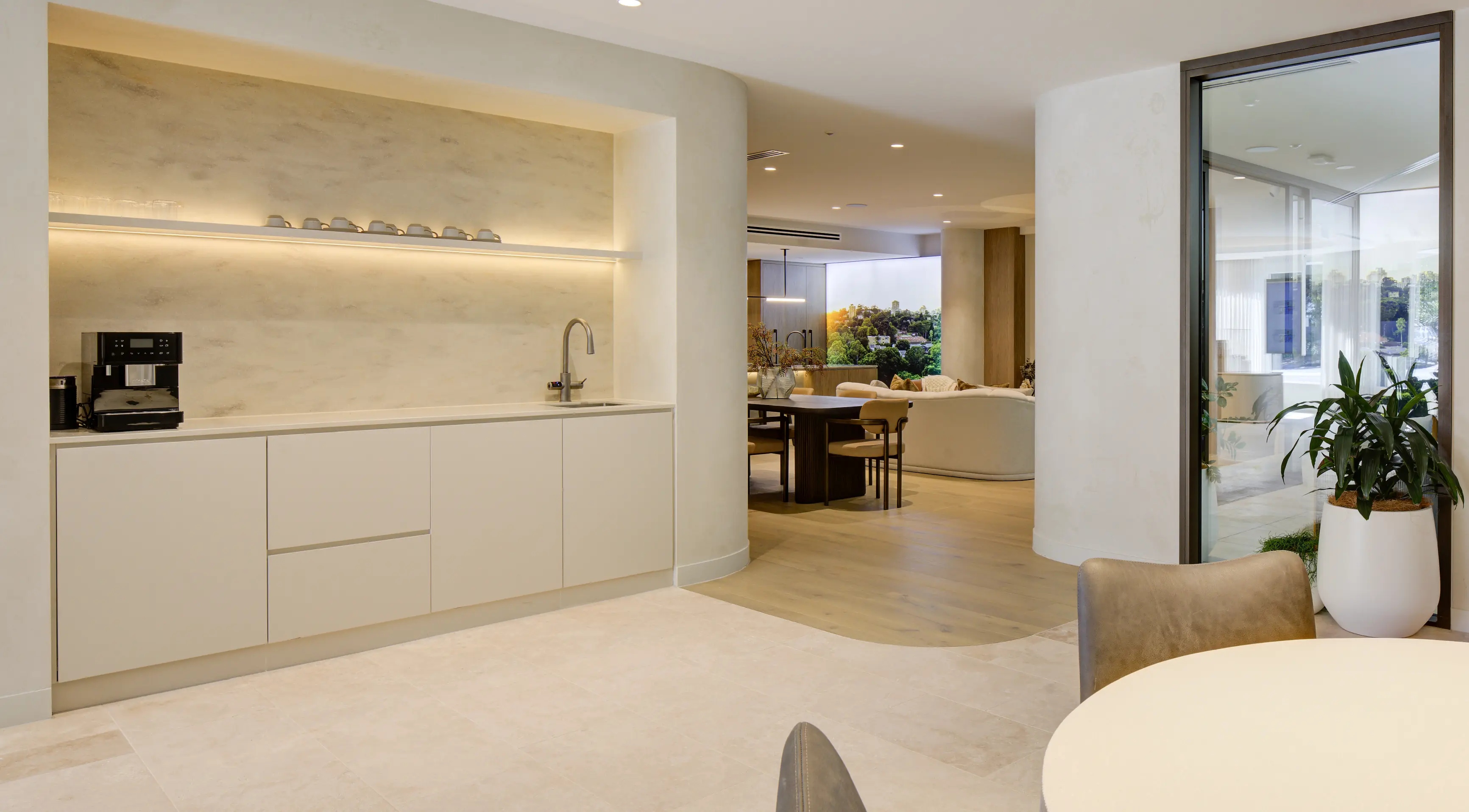 Designed in two distinctly programmed wings, the Waterstone Display Suite is driven by the experience of the prospective purchaser as future resident of the development and celebrates the rich design of both the architecture and interiors with intention and sophistication.